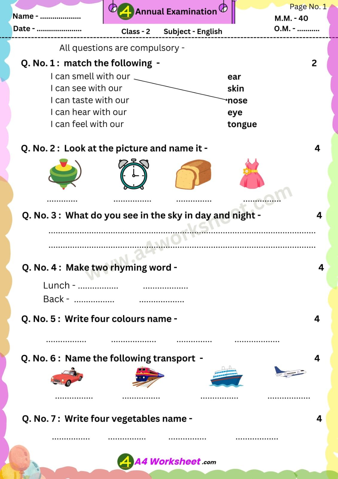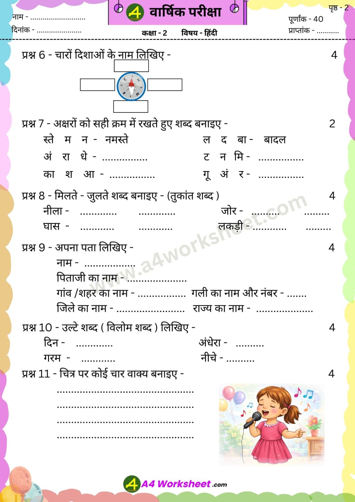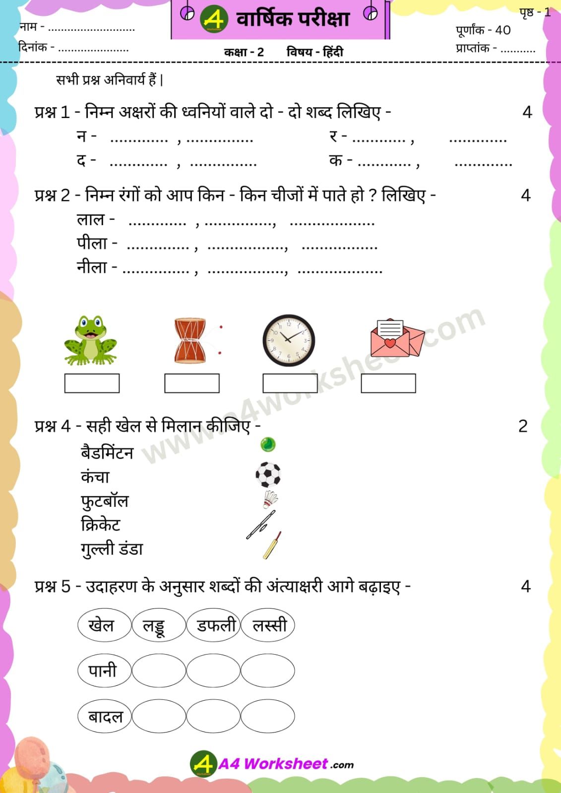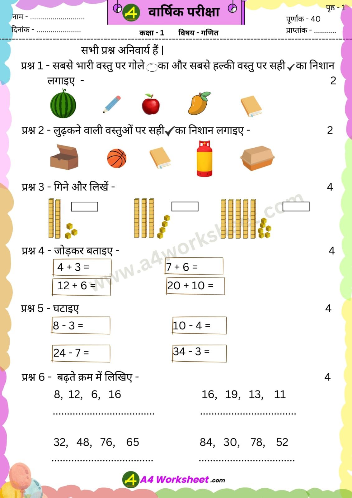 a4 worksheet.com – प्रस्तुत करते हैं, वार्षिक परीक्षा के पेपर जिसमें, आप कक्षा 1 और 2 के पेपर free में download कर सकते हैं । पेपर कक्षा के अनुसार NCERT की किताबों पर आधारित हैं । जिसमें सरल और कठिन दोनों स्तरों के आधार पर प्रश्न विभाजित हैं । बच्चों की रुचि अनुसार चित्रों का समावेश किया गया है । और लिखने के लिए पर्याप्त जगह दी गई है । Exam Paper में नंबरों का विभाजन किया गया है जो कि शिक्षकों को मूल्यांकन करते समय मदद करेगा । अभी केवल इस वर्ष का वार्षिक परीक्षा के लिए paper उपलब्ध हैं । जल्द ही समय पर Monthly Test और Unit Test इकाई परीक्षा के पेपर update ho जाएंगे । PDF download का लिंक images के बाद दिया गया है |