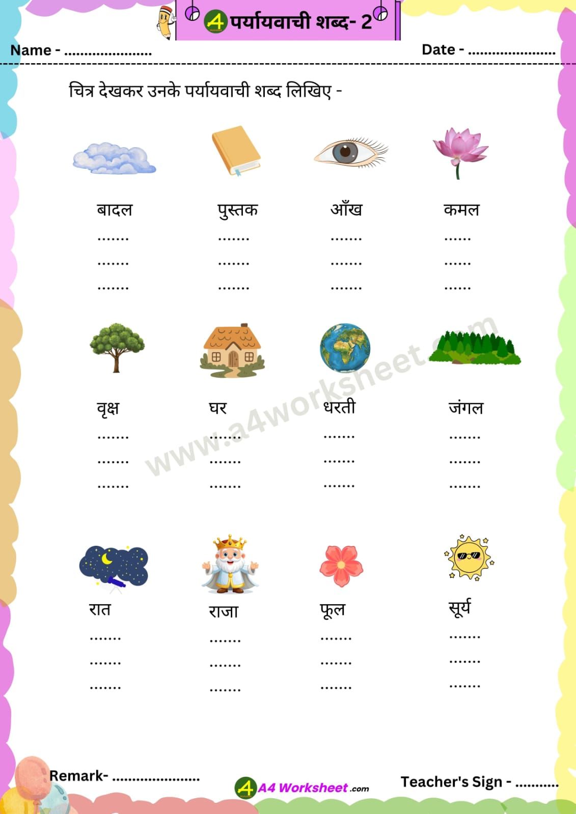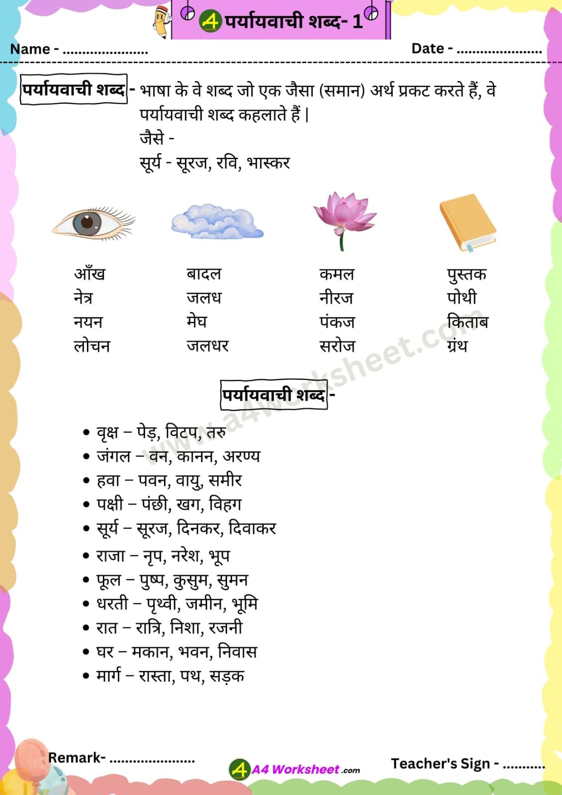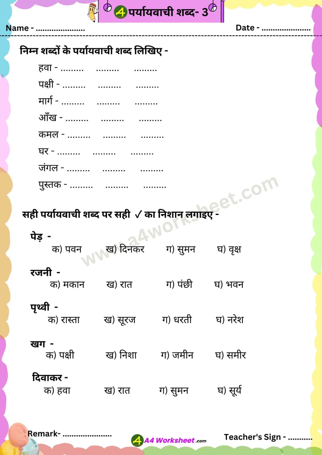 A4 worksheet प्रस्तुत करता है – पर्यायवाची शब्द (Prayaywachi Shabd) पर आधारित Worksheet | जिसमें पर्यायवाची शब्द के साथ उन पर आधारित संभावित प्रश्न और वाक्यों का अर्थ के साथ जोड़ना शामिल है |Worksheet की PDF आप पोस्ट के आखिर में दिए लिंक से डाउनलोड कर सकते हैं । स्तर अनुसार Vilom Shabdon को दो भागों में विभाजित किया गया है –